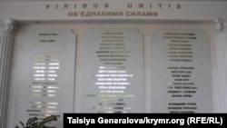 В фойе школы бросается в глаза доска, на которой золотыми буквами перечислены фамилии людей, оказавших помощь в становлении гимназии. Сегодня она зияет пустыми строками – там еще остается след от старательно стертых кем-то фамилий. С доски удалены имена украинских и многих крымских политиков, многих спонсоров. Например, стерта фамилия Джорджа Сороса, хотя гранты его благотворительного фонда были одной из опор во времена становления гимназии – за счет их покупались учебники и технические средства обучения. В помещении еще вывешены украинские рушники, но это уже просто дань традиции, искажение реальности, ведь на сцене актового зала уже выставлены флаги только России и Крыма, а сама гимназия уже на три четверти русская. Изменится и само название школы, из него уберут название «украинская», под вопросом и статус гимназии, поэтому и. о. директора Елена Безнищенко со сцены и в интервью старательно обходит слово «гимназия» и говорит – «учреждение»…