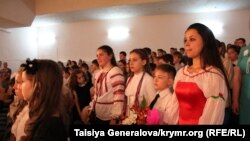 Не стала исключением из этого ряда и Симферопольская украинская гимназия, в которой нынешний выпуск можно считать юбилейным – он 15-й по счету. Родители помнят, что ранее такие собрания, даже не юбилейные, всегда проводились с искренними чувствами и душой. Но сегодня на школьном дворе, который ранее, как правило, был празднично украшен, нет никаких признаков праздника – ни флагов, ни транспарантов, ни лозунгов, ни приветствий гостям. Изменился и сам внешний вид учеников и родителей – только самые убежденные решились надеть вышиванки, совершенно нет символики Украины – ни флагов, ни украшений в украинских цветах. На учениках одежда без национальных признаков, у одного класса синие, у другого красные ленты через плечо.