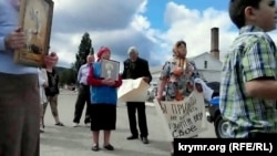 Но на улице, перед церковью, прихожан ожидали люди с плакатами, на которых было написано – «Иван Катькало – провокатор», «Нет Правому сектору в Крыму». По словам очевидцев, женщины и дети с плакатами появились вместе с крымской «самообороной».