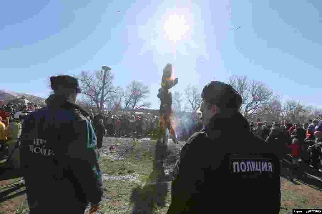 Затем, попрощавшись с Зимой, сожгли пятиметровое чучело Масленицы.