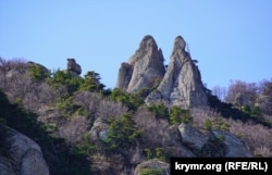 Правда, на саму ее вершину и даже в Долину привидений мы все же не поднялись. Наша неизменная руководительница Людмила, которая, к слову, водит туристические группы по Крыму при благоприятных погодных условиях (хотя случалось, что нас на маршруте накрывали обильные дожди и ливни) чуть ли не каждую неделю, решила, что группа после долгого зимнего перерыва еще не готова к такому сложному маршруту. Поэтому ограничилась прохождением только южными склонами Демерджи. Впрочем, оттуда удивительные причудливые скалистые «зубцы» (туристы нарекли их «семейной парой») тоже производили сильное впечатление.