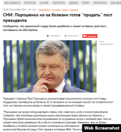А сайт российского канала «Рен-ТВ» сначала сообщил, будто бы СМИ написали об отставке Порошенко из-за болезни, а чуть позже – что «Порошенко из-за болезни готов «продать» пост президента».