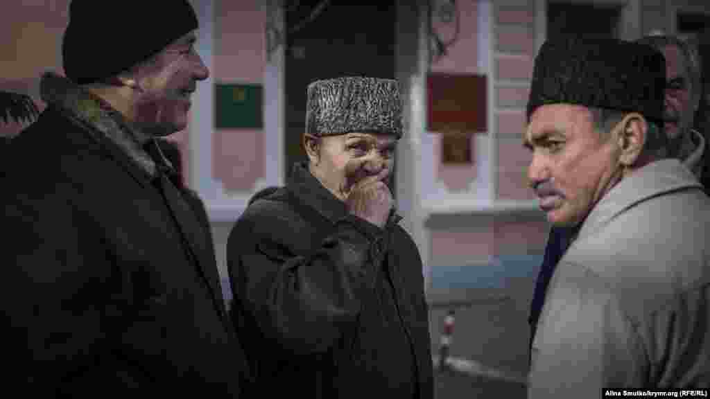 В Центральном районном суде Симферополя 17 октября прошло очередное судебное заседание по «делу 26-го февраля». У дверей суда Алие, мать одного из фигурантов дела Мустафы Дегерменджи, провела свой 51-й день рождения. Друзья и родственники подсудимых пришли поздравить и поддержать Алие.