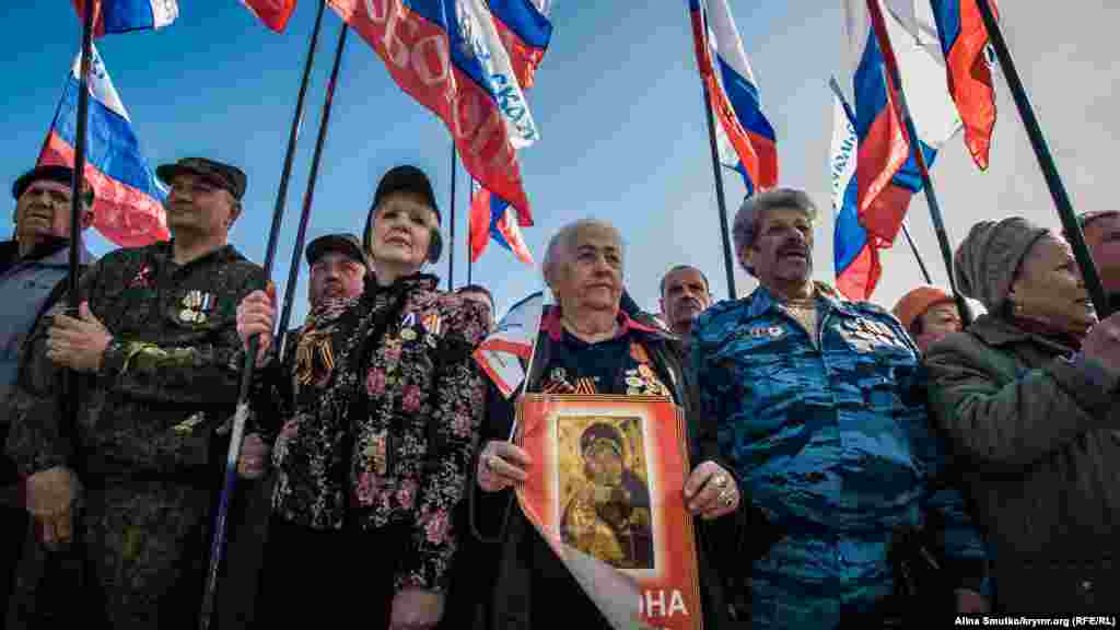Возле памятника «Солдат и Матрос» в Севастополе прошел митинг, посвященный третьей годовщине «присоединения» Крыма к России. На мероприятии присутствовали местные чиновники, депутаты Госдумы РФ, члены Совета Федерации, а также лидер «путинских» байкеров Александр «Хирург» Залдостанов.