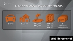Сегодня у Елены Аксеновой есть автомобиль «БМВ» за 120 тысяч долларов (более трех миллионов гривен), дом почти в шестьсот квадратов, два земельных участка, три квартиры и шесть нежилых помещений.