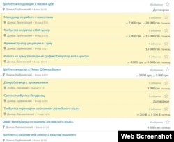 Судя по этим спискам, на сегодняшний день наиболее востребованными должностями в Донецке являются: акушерки, медсестры, врачи, бухгалтеры, водители, воспитатели, дворники, инженеры и каменщики. Также популярными на рынке труда сейчас считаются кровельщики, маляры, научные сотрудники, преподаватели, операторы котельной, плотники, продавцы, рабочие зеленого строительства, уборщики, слесари и другие специалисты. Аналогичная ситуация и в других городах, подконтрольных группировке «ДНР».