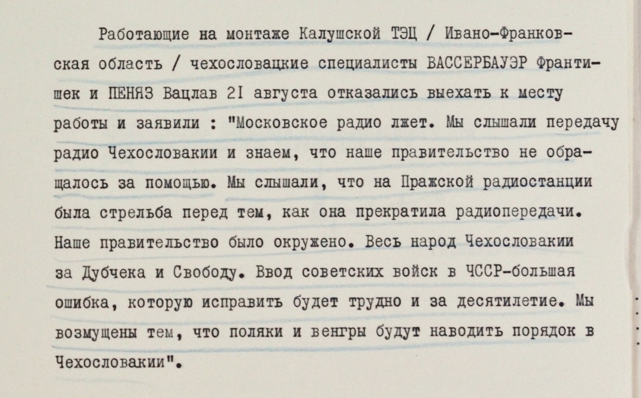 Специалисты из ЧССР Франтишек Вассербауэр и Вацлав Пеняз, работавшие на Калушской ТЭЦ в Ивано-Франковской области, в первый день вторжения демонстративно не вышли на работу. Ввод войск они назвали “большой ошибкой, которую исправить будет трудно и за десятилетие”.