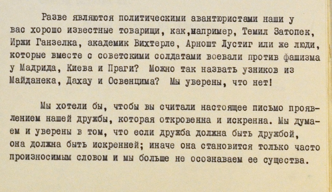 Другой поджанр политических писем Пражской весны – коллективные обращения. Как правило, их сочиняли и подписывали работники чехословацких заводов – и отправляли советским коллегам, с которыми раньше имели контакты. Например, 98 сотрудников проектного и конструкторского бюро завода №3 Витковицкого меткомбината отправили письмо ждановским металлургам с “Азовстали”. Рабочие уверяют, что инициаторы и сторонники чехословацких реформ – не “политические авантюристы”, а настоящие коммунисты, люди, которых знают в СССР. Среди них – легкоатлет, многократный олимпийский чемпион Эмиль (в документе - Темил) Затопек1, писатель Иржи Ганзелка2, изобретатель мягких контактных линз Отто Вихтерле3, писатель Арношт Лустиг4, участники антифашистского сопротивления и узники нацистских концлагерей.