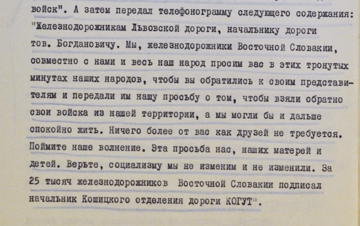 Письма в СССР с заверениями о дружбе ничем не помогли: в ночь на 21 августа началось полномасштабное военное вторжение в ЧССР, известное как операция “Дунай”. Следующие несколько месяцев чехословацкие граждане не оставляли попыток “достучаться” до советских людей любыми способами – по телефону и радио, в письмах и личных беседах. В первый же день операции львовские железнодорожники получили телефонограмму от коллег из Восточной Словакии. Те просили передать советскому руководству их просьбу “о том, чтобы взяли обратно свои войска на нашей территории, а мы могли бы и дальше спокойно жить”.