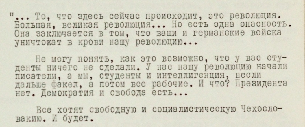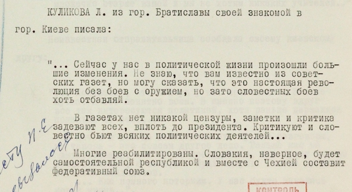 “Тревожным звоночком” для КГБ были намеки чехословаков на то, что советским гражданам стоило бы взять с них пример. Из письма жителя Праги Юрия Хары одесской девятикласснице: “Не могу понять, как это возможно, что у вас студенты ничего не сделали. У нас нашу революцию начали писатели, а мы, студенты и интеллигенция, несли дальше факел, а потом все рабочие”.