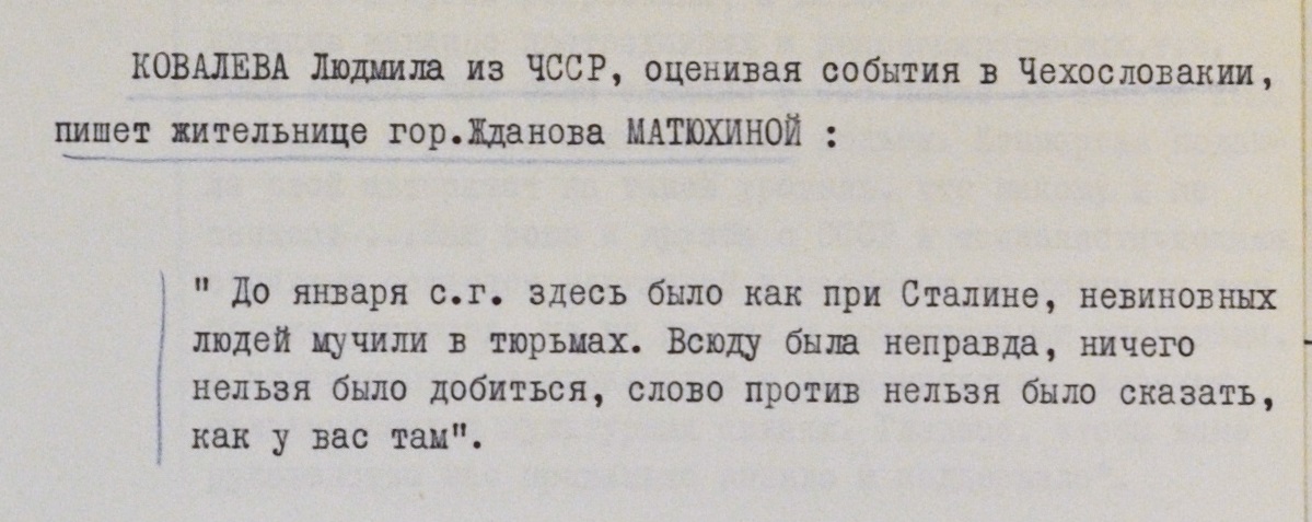 Если на ранних этапах Пражской весны в поле зрения чекистов попадали обычные письма друзьям и родственникам, то позже, летом, характер отбираемой корреспонденции меняется. Теперь чехословацкие граждане часто пишут в СССР с четкой целью: убедить, что происходящее у них – не контрреволюция, что никто не хочет отказываться от социализма и рвать отношения с восточным соседом. Видимо, люди верили, что это как-то спасет страну от военного вторжения.