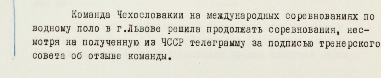 Чехословацкая команда в конце августа приехала во Львов на соревнования по водному поло. После начала операции “Дунай” тренерский совет прислал спортсменам телеграмму об отзыве команды. Но игроки решили остаться и выступать дальше. КГБ посчитал это проявлением лояльности по отношению к СССР.