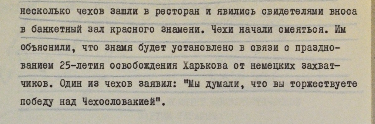 В конце августа в Украине выступал знаменитый чешский оркестр Карела Влаха. С ним было связано два инцидента, отмеченных в документах КГБ. На встрече с артистами ГДР и Бразилии в Донецке чехи отказались играть, пояснив, что у них траур.Трагикомичная ситуация произошла в Харькове. В гостиничном ресторане музыканты увидели красное знамя, которое вносили в банкетный зал, и засмеялись. Им объяснили, что готовится празднование юбилея освобождения Харькова от нацистов. “Мы думали, что вы торжествуете победу над Чехословакией”, – ответил один из артистов.