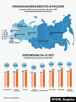 Раковые заболевания считаются второй из основных причин смерти в мире. В 2018 году от онкологии, согласно данным Всемирной организации здравоохранения (ВОЗ), умерли 9,6 миллиона человек. Россия находится на пятом месте по числу смертей от раковых заболеваний. Еще хуже дело обстоит в Китае, Индии, США и Японии. Меньше всего от рака умирают в Новой Зеландии. Все эти данные представлены в материале проекта Радио Свобода "Фактограф".