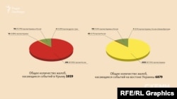 Итак, из всех 10 500 жалоб, поданных против Украины, подавляющее большинство – то есть почти 7000 – связаны с событиями на востоке страны и в Крыму.