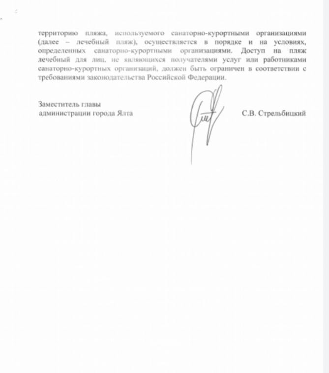 «Сообщаем, что свободный проход к Гаспринской набережной возможен от остановки общественного транспорта «Марат». В целях предупреждения возникновения и распространения инфекционных заболеваний доступ на территорию пляжа, используемого санаторно-курортными организациями (далее – лечебный пляж), осуществляется в порядке и на условиях, определенных санаторно-курортными организациями. Доступ на пляж лечебный для лиц, не являющихся получателями услуг или работниками санаторно-курортных организаций, должен быть ограничен в соответствии с требованиями законодательства Российской Федерации», – заявил Сергей Стрельбицкий в ответ на обращение жительницы Балашихи Московской области соседней России Ольги Чесноковой.