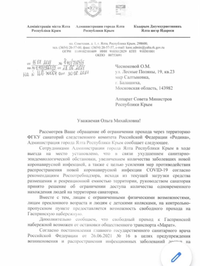 Всем остальным гаспринцам и гостям поселка замглавы администрации Ялты Сергей Стрельбицкий, так же, как и представитель санатория «Родина», рекомендует ходить к морю в обход. Документ обнародован в группе «Подслушано Ялта» в соцсети «Вконтакте» (сохраненные скриншоты: первый, второй).