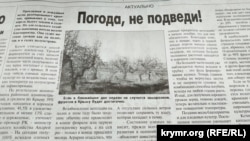 В статье «Погода, не подведи!» «Крымская правда» пишет о том, как дожди, установившиеся в Крыму, влияют на сельское хозяйство. «Прохладная и дождливая весна разочаровывает крымчан, привыкших к тому, что апрель балует теплом и солнцем. Но для сельского хозяйства нынешняя погода весьма благоприятна. Она сулит высокие урожаи как на полях, так и в садах полуострова», – отмечает издание. Газета напоминает, что Крым считается зоной озимого земледелия. Урожай формируется за счет запасов зимне-весенней влаги, поэтому большую часть получаемого за год зерна поступает с озимых посевов, а не с яровых. В этом году гибель озимых зерновых культур из-за воздействия низких температур на полуострове не зафиксирована.