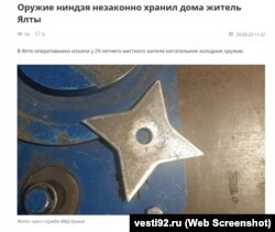 А теперь из идиотских новостей: криминальная хроника. Вдруг к вам, скажем, приходят сотрудники правоохранительных органов (кстати, а почему?) и спрашивают вас: «А нет ли у вас оружия ниндзя?». И да,оно таки у вас есть. И цвет еще такой подозрительный, да…