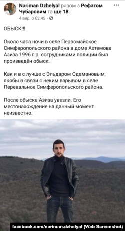 В субботу 4 сентября с самого утра гражданское объединение «Крымская солидарность» и ряд активистов начали сообщать о задержании зампреда Меджлиса крымскотатарского народа, Наримана Джеляла. Ранее около 3 часов ночи 4 сентября появилась информация об обыске в домовладении крымского татарина Азиза Ахтемова. Пост с информацией об этом – последний пост на странице, написанный Джелялом перед его задержанием.