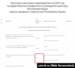 Существенные изменения могут коснуться и программы празднования «Дня воссоединения» Крыма с Россией – годовщины российского захвата Крымского полуострова. Подробного плана мероприятий в открытом доступе пока нет. Но изменения уже можно заметить в публичном плане основных культурно-массовых мероприятий на 2023 год, который утвержден министерством культуры подконтрольного России правительства Крыма.