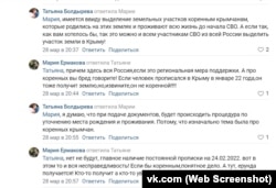 «Имеется в виду выделение земельных участков коренным крымчанам, которые родились на этих землях и проживают всю жизнь до начала «СВО». А если так, как вам хотелось бы, так это можно и всем участникам «СВО» из всей России выделить участок земли в Крыму!» – отвечает ей Татьяна Болдырева из Феодосии.