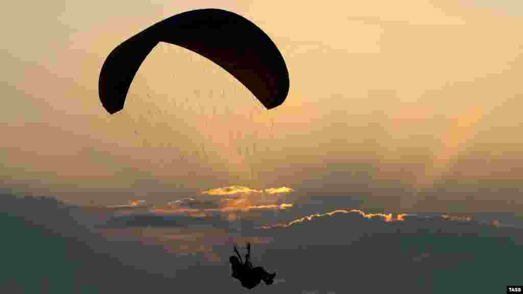 Спортсмен из парапланерного клуба во время полета в окрестностях горы Клементьева.