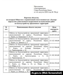 Например, согласно указу Сергея Аксенова от 6 августа 2020 года № 786-рг, ООО «Луксар» определен единственным подрядчиком на выполнение шести керченских дворов на общую сумму 115 443 510,00 рублей.