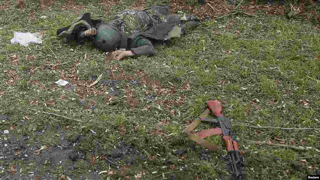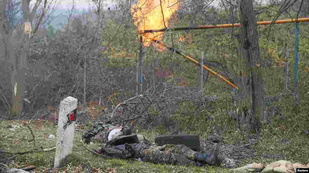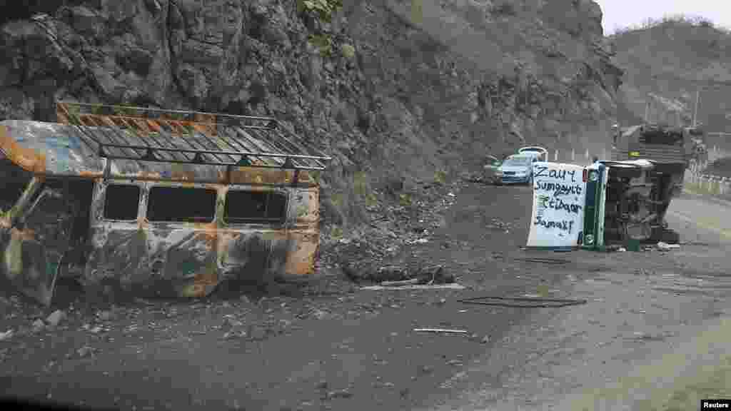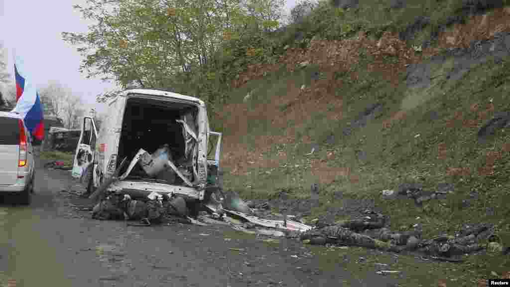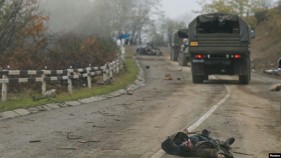 Тело лежит на дороге недалеко от города Шуша. Фотографии в этой галерее сняты с колонны российских миротворцев, проезжающей мимо города 13 ноября