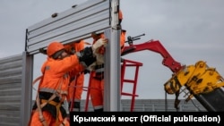 На железнодорожной части Керченского моста устанавливают шумозащитные экраны и стойки освещения.
