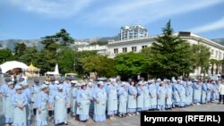 На городской набережной Ялты 23 июня к «присяге» привели местных дворников. Работники давали «клятву чистоте» в новой, специально пошитой спецодежде, стилизованной в русском стиле ХIX века, сообщает корреспондент Крым.Реалии.