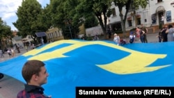 Эта акция проходит с 15 июня. Флаг крымскотатарского народа размером 16 на 9 метров пошили волонтеры в Краматорске в Донецкой области.