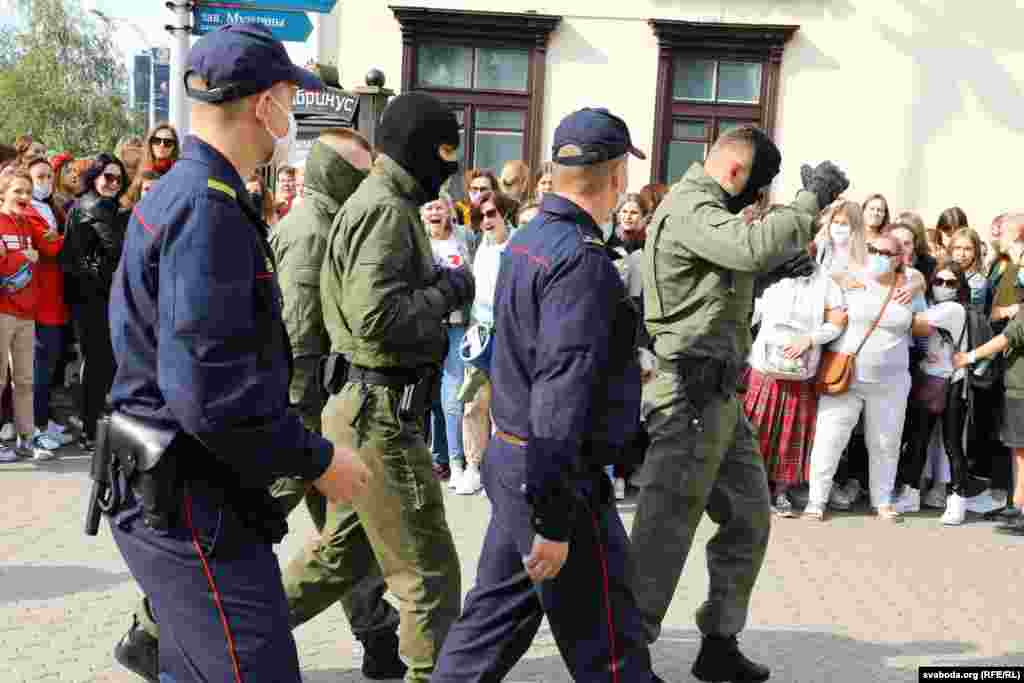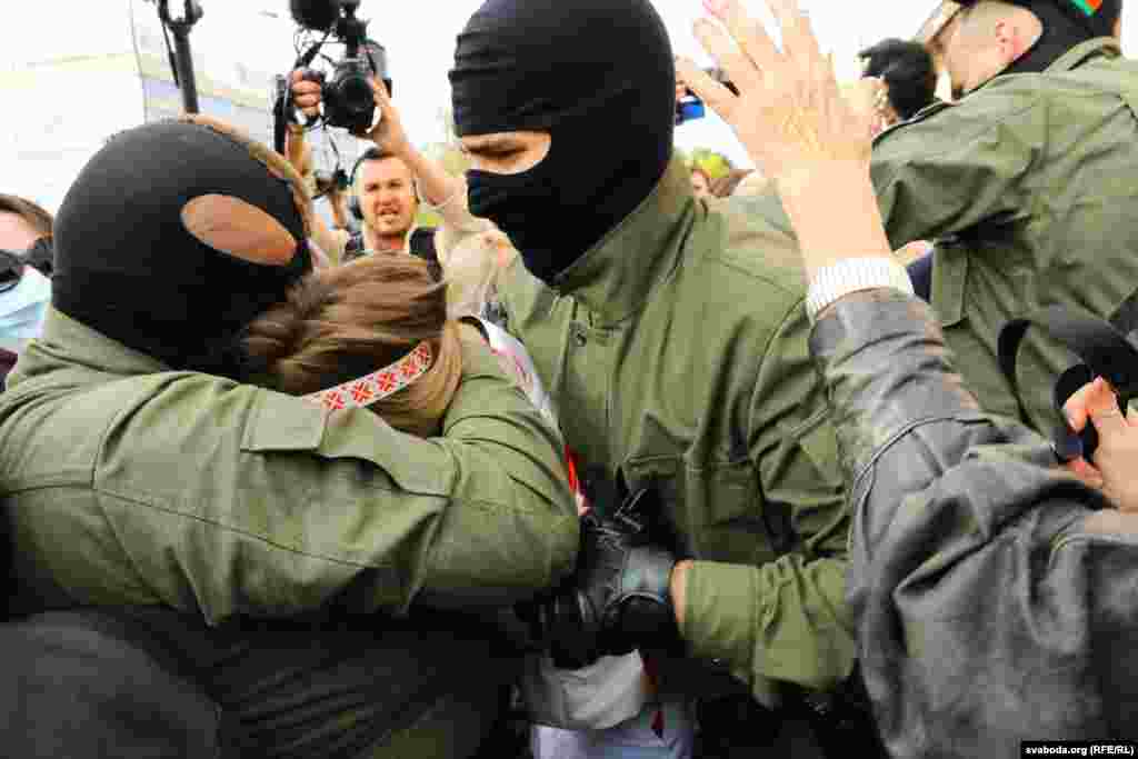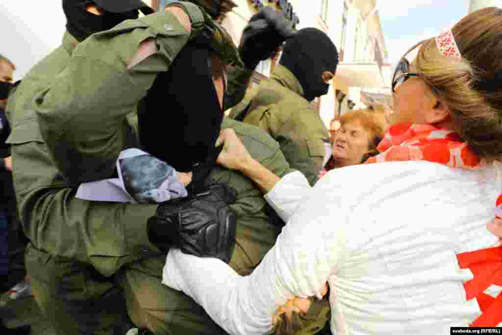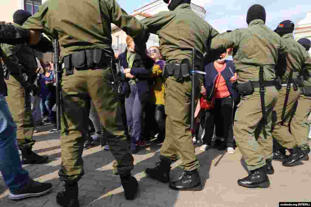 Вскоре после начала собрания до площади Свободы подъехали маршрутки с тонированными стеклами и пять автозаков. Из них вышли силовики, которые начали задерживать женщин: некоторых тянули по земле.
