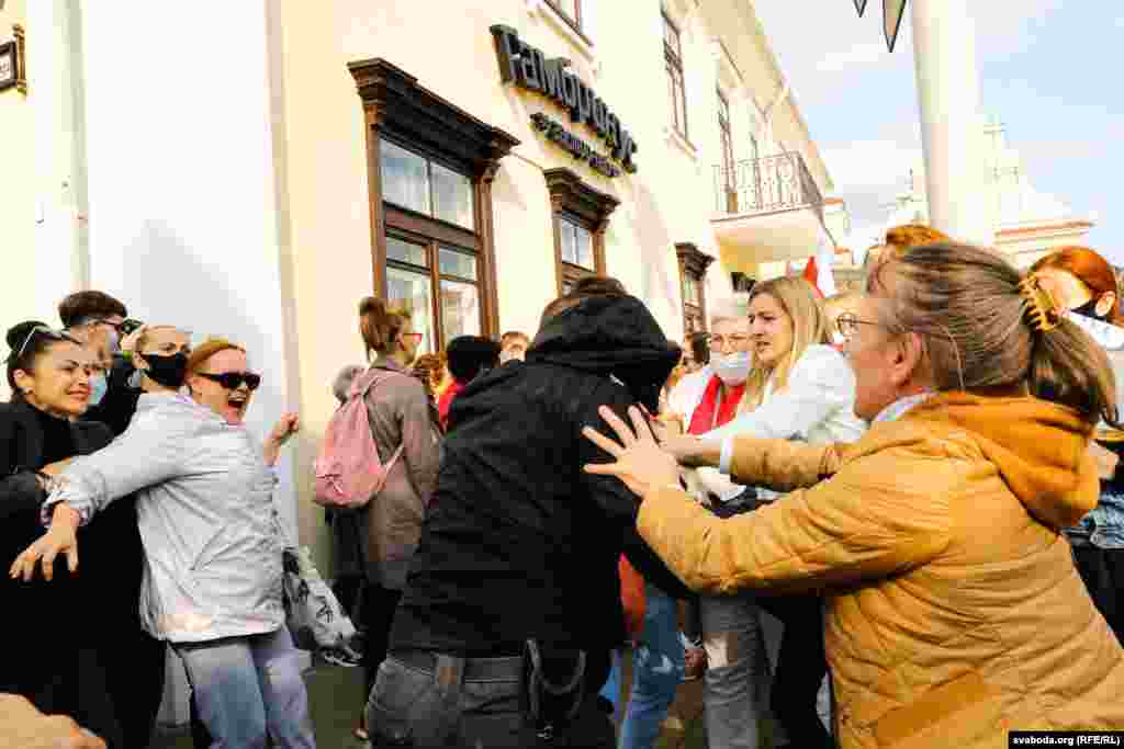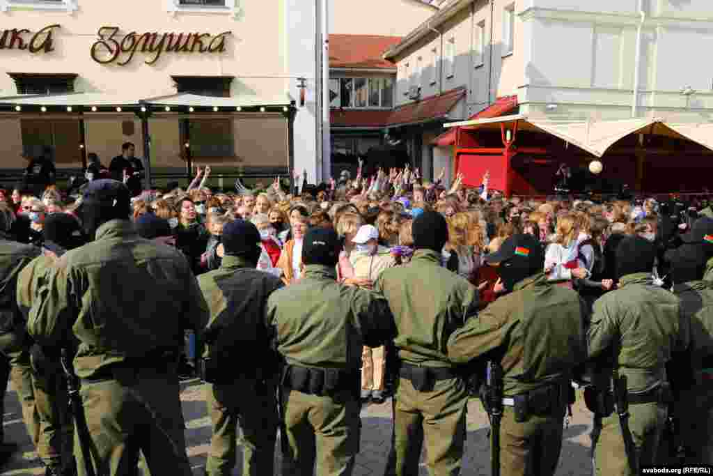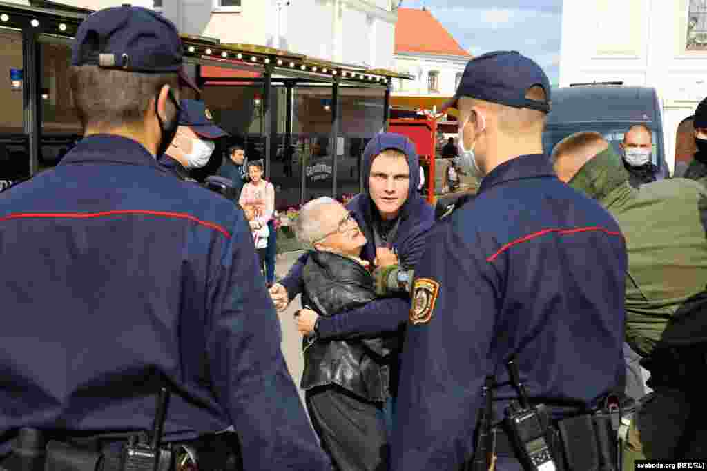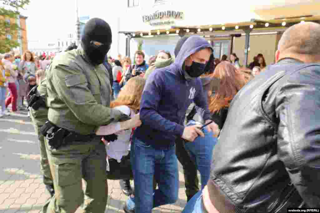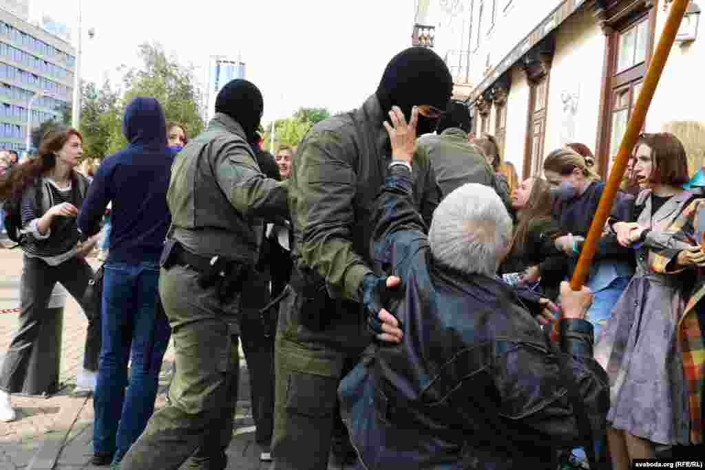 Вскоре после начала собрания до площади Свободы подъехали маршрутки с тонированными стеклами и пять автозаков. Из них вышли силовики, которые начали задерживать женщин: некоторых тянули по земле.