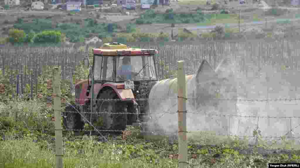 Трактор, распыляющий химикаты на виноградниках «Золотой Балки» | Крымское фото дня