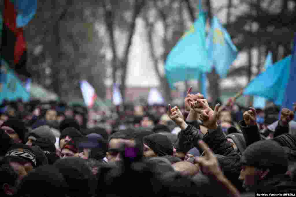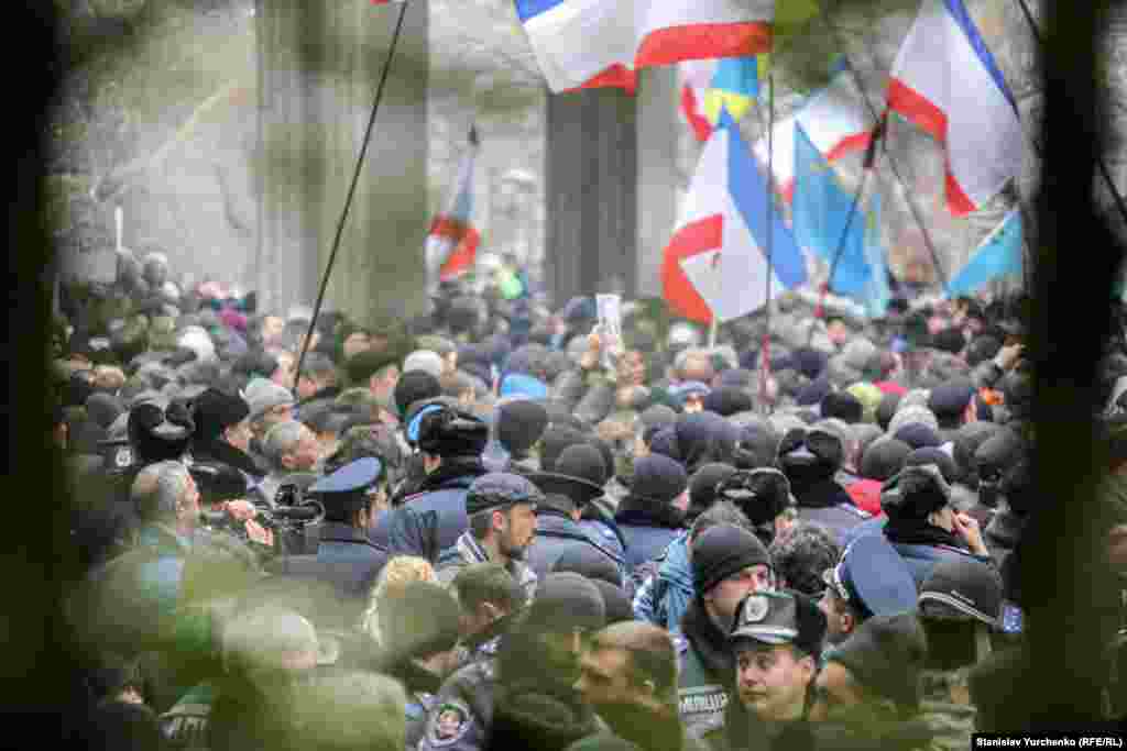 В Симферополе события могли бы развиваться по такому же сценарию. Однако проукраинским участникам митинга удалось добиться переноса сессии крымского парламента. Она состоялась на следующий день, 27 февраля. В захваченном российскими военными здании, под кураторством сотрудников российских спецслужб депутаты проголосовали за проведение «референдума», который впоследствии стал основанием для аннексии Крыма властями России.