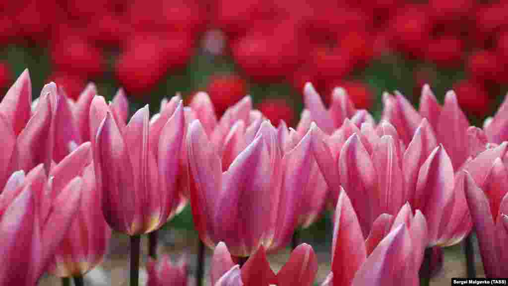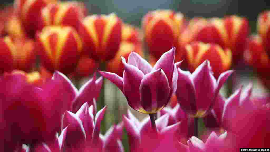 В Никитском ботаническом саду стартовал «Парад тюльпанов». Современная коллекция насчитывает 300 сортов и 900 гибридных форм. Ежегодная выставка тюльпанов проходит уже в 14-й раз.