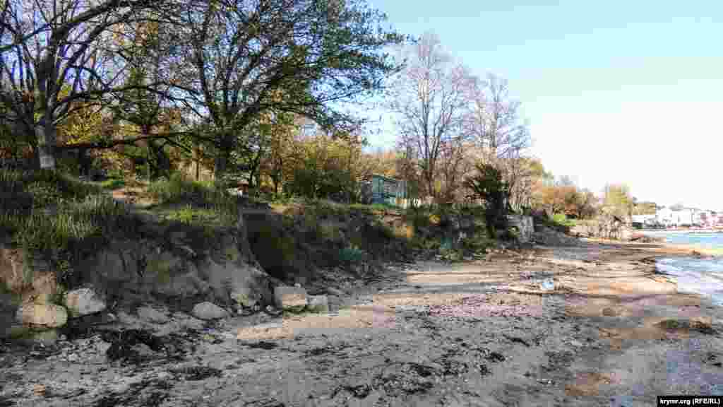 Лестница, ведущая к пляжу, нуждается в укрепительных работах, но городские власти ограничились размещением таблички с сообщением, что здесь купаться запрещено.