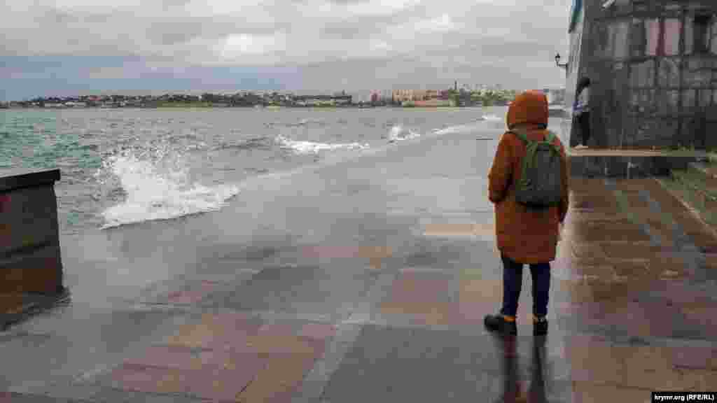 Корреспондент Крым.Реалии побывал в Севастопольской бухте и снял, как огромные волны разбиваются о берег.