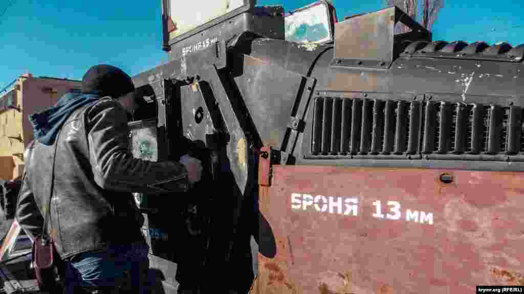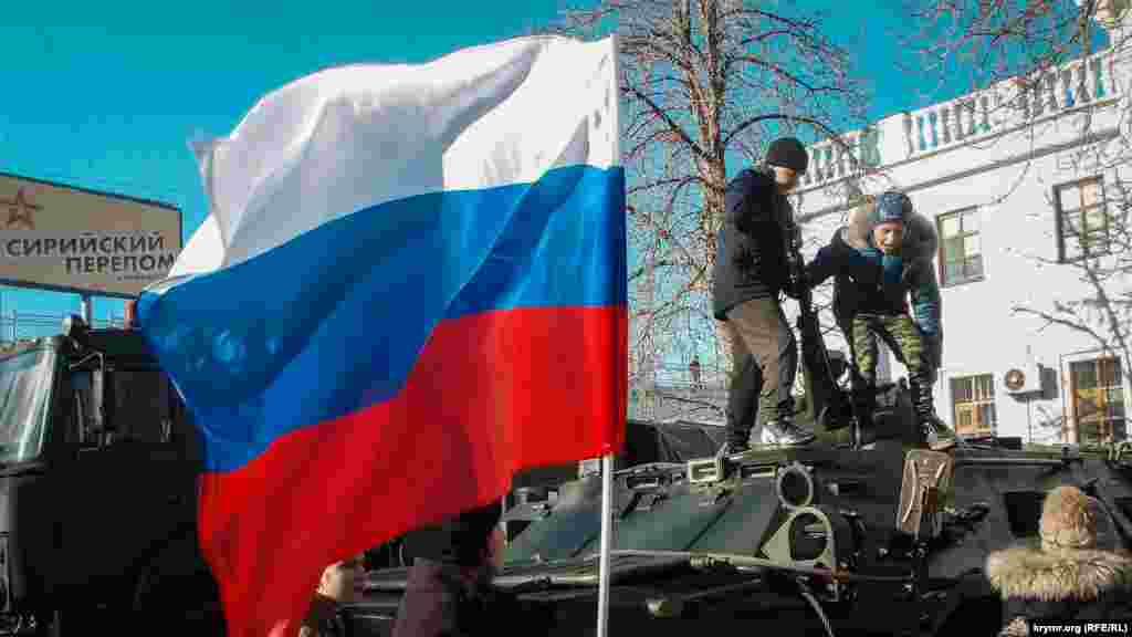 По информации корреспондента Крым.Реалии, вместе с передвижной выставкой в Севастополь приехали представители правительства Сирии. Два десятка сирийцев устроили импровизированный флешмоб: залезли на броневик и с криками «УРА!» размахивали российскими и сирийскими флагами.
