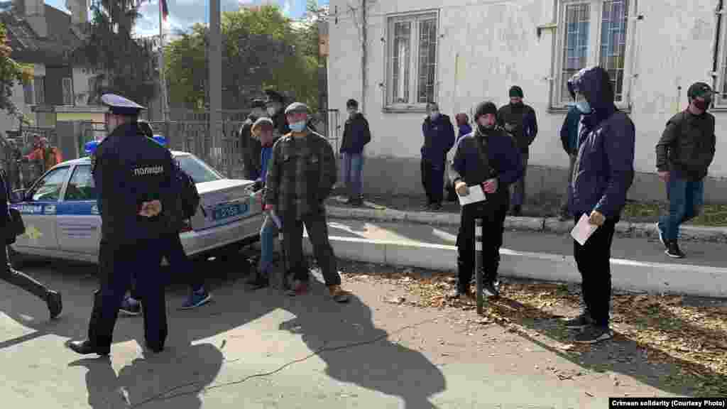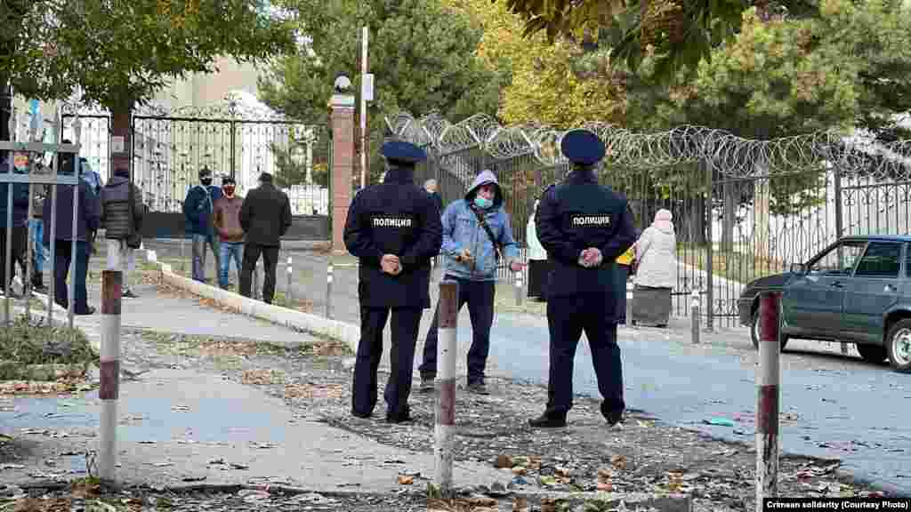 Утром 25 октября у здания Крымского гарнизонного военного суда в Симферополе собрались крымские татары, чтобы поддержать фигурантов красногвардейского «дела Хизб ут-Тахрир». В суде адвокаты по видеоконференцсвязи должны были принять участие в рассмотрении апелляционной жалобы на приговор по данному делу. Российские полицейские потребовали собравшихся разойтись, после чего сотрудники ОМОНа начали заводить собравшихся под судом в автобус, в том числе женщин.