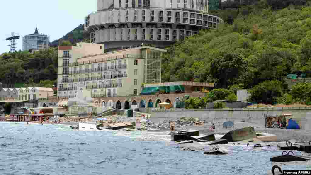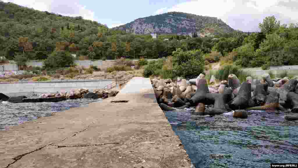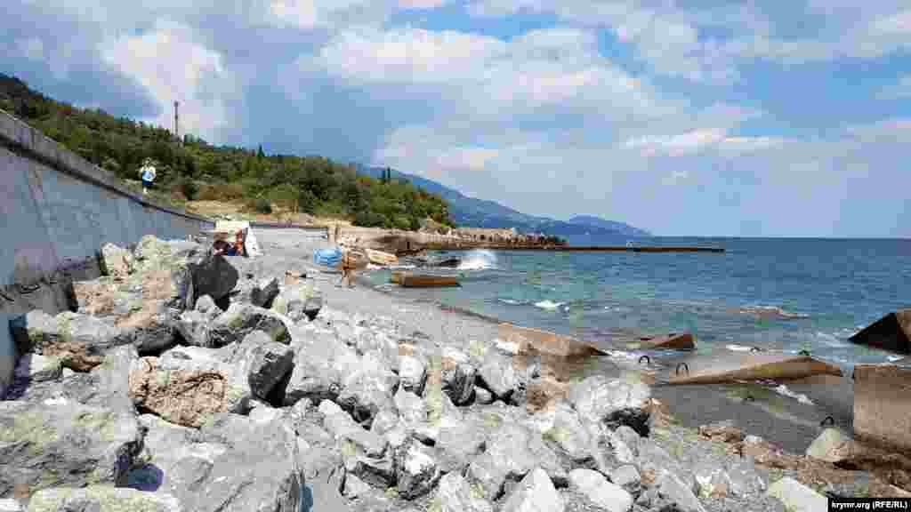 «Проход на причал закрыт» – такая табличка встречает отдыхающих на входе на «Золотой пляж» поселка городского типа Курпаты (Большая Ялта). Часть территории у моря здесь завалена бетонными плитами. Чуть поодаль – большое количество железобетонных волнорезов. Таким образом здесь спасают береговую линию от штормов.