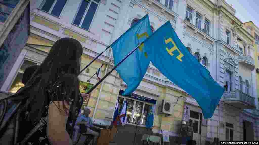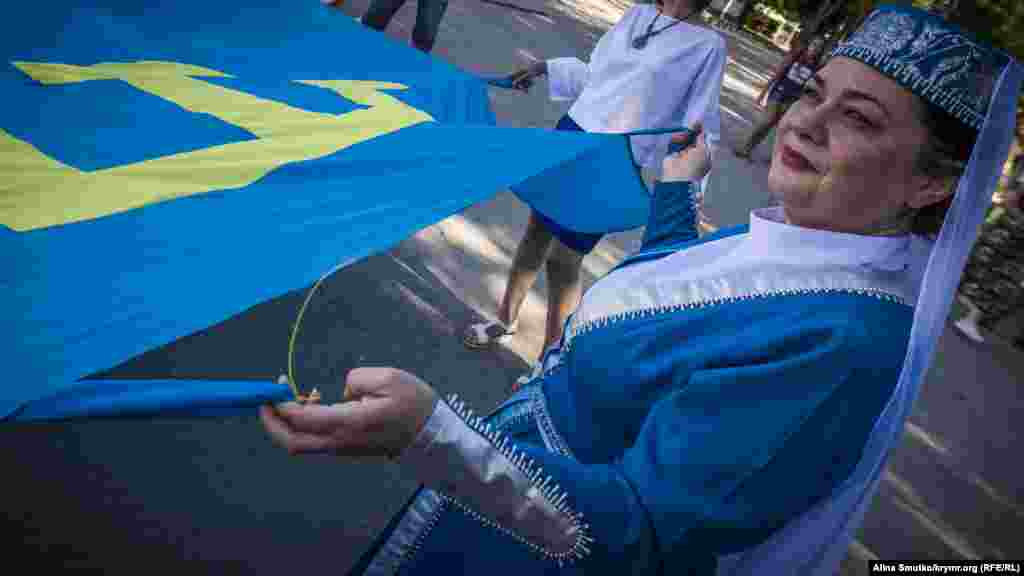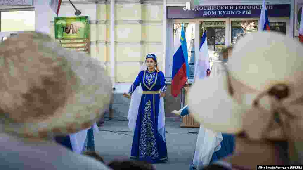 День национального флага крымских татар отметили в Феодосии. Несколько десятков горожан и туристов собрались на привокзальной площади посмотреть на праздничный концерт. Помимо народных песен и танцев, артисты вынесли на площадь огромный флаг и прочитали молитву вместе с имамом.