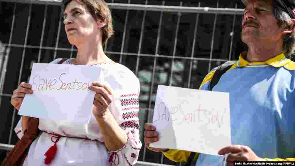 В Киеве у здания посольства России в Украине 24 мая прошла акция в поддержку украинского политзаключенного Олега Сенцова, который 14 мая объявил голодовку, находясь в колонии российского города Лабытнанги.