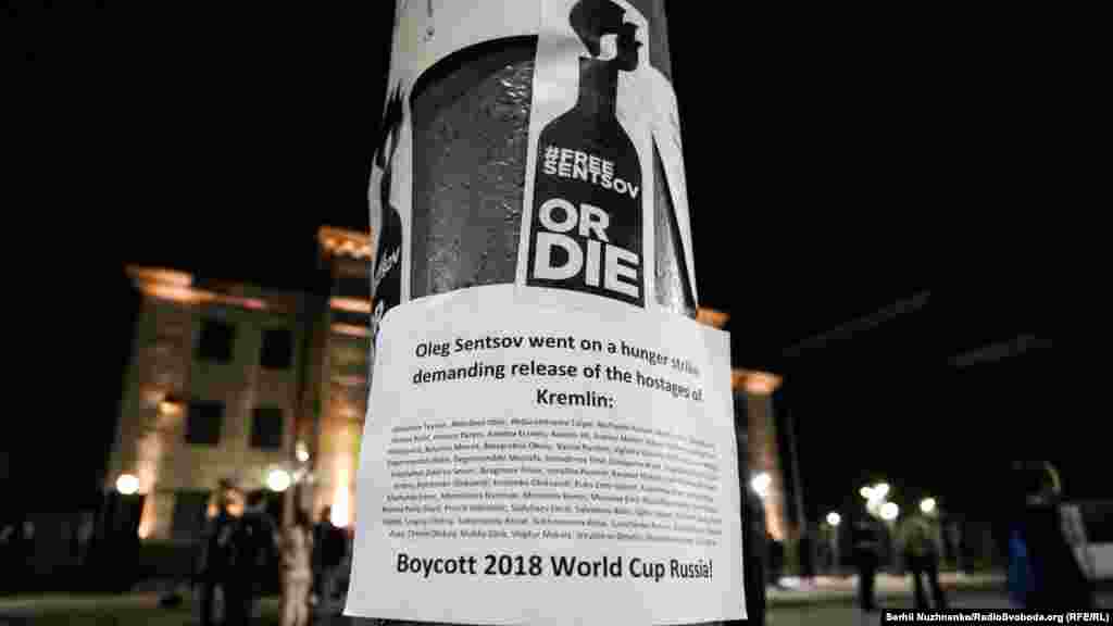 Здание посольства России в Украине в Киеве 25 мая подсветили языками пламени, изображением голодающего в России украинского режиссера Олега Сенцова и других политузников Кремля.