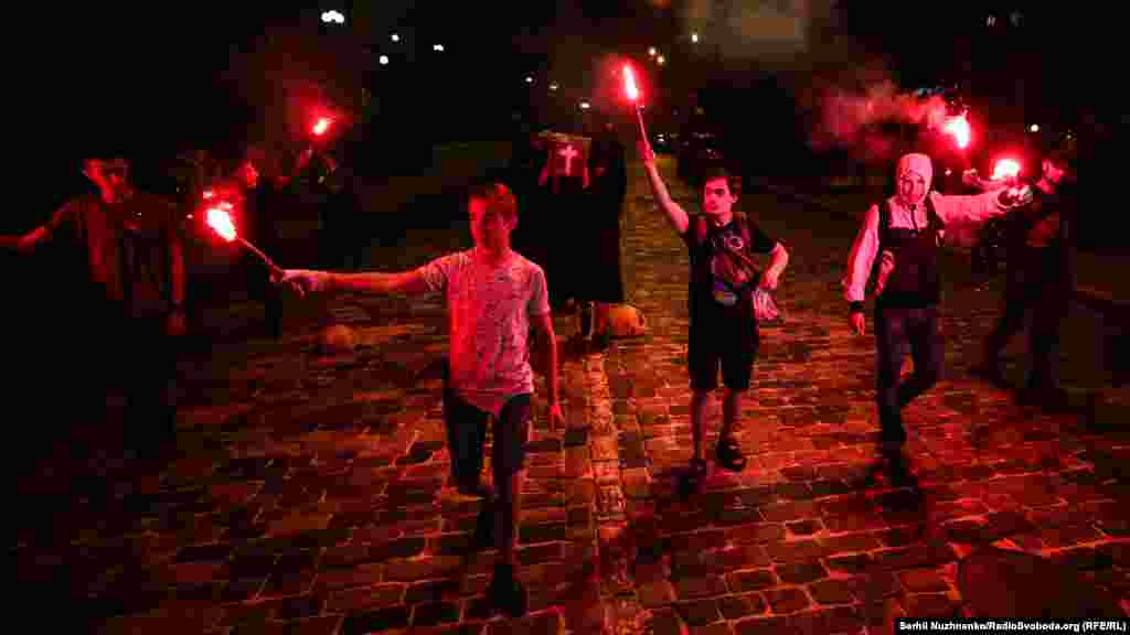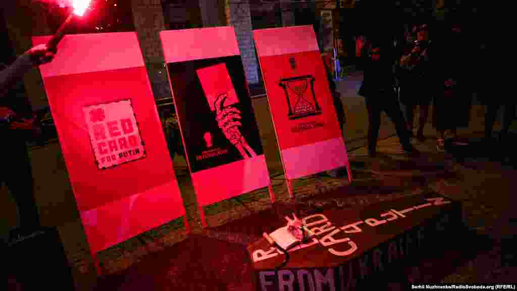 В рамках международной кампании #RedCardForPutin поздно вечером в понедельник 16 июля в Киеве прошла акция-перформанс «БАНДЕРоль для Путина».