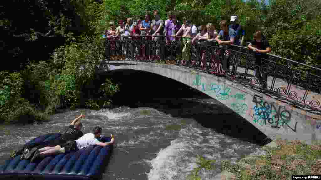 В Симферополе 4 июня ко Дню города устроили гонки на каяках и матрасах. Горожане спускалась вниз по реке Салгир. Для этого из Симферопольского водохранилища специально спустили воду.