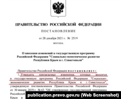 О решении правительства России отменить ФЦП для Крыма российские СМИ сообщили в начале января. Но соответствующее постановление, обнародованное на официальном интернет-портале правовой информации, датировано 28 декабря 2021 года.