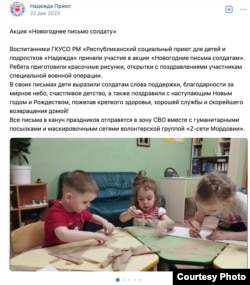 Письма и открытки российским солдатам, воюющим в Украине, школьники и воспитанники детских садов традиционно отправляют на Новый год и в День защитника отечества. В преддверии Нового года в России прошла акция "Новогодние письма солдатам". Российские школы, детские сады и даже приюты отчитывались о результатах прошедшей акции в социальных сетях. Так, саранский "Республиканский социальный приют для детей и подростков "Надежда" в конце декабря 2023 года опубликовал пост, в котором рассказал, что воспитанники приюта "подготовили красочные рисунки, открытки с поздравлениями участникам специальной военной операции". В письмах дети "выразили солдатам слова поддержки, благодарности за мирное небо, счастливое детство".