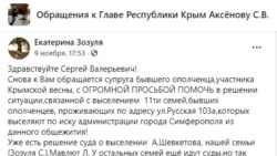 О грядущем выселении из общежития российскому главе Крыма Сергею Аксенову жалуется супруга бывшего ополченца, участника «крымской весны» Екатерина Зозуля. Она просит его «помочь в решении ситуации».